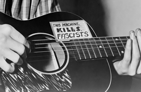 The root, it seems to me, is in folk music. In fact, I have a written record of perhaps the first moment that a musician decided to forgo payment in return for their own integrity. Of course I cannot be sure it is the very first, but it could be the most influential. In Woody Guthrie’s autobiography ‘Bound for Glory’, he writes of finding himself playing to a team of advertising executives in a New York skyscraper. ’65 storeys back to the world.’ he says, ‘Quite a little elevator ride down to where the human race was being run’. After having his song described as ‘Extremely colourful’ though not necessarily ‘suited to our customers’, a short discussion of his image is had and it is thought that a Pierrot costume might best endear the clientele to his style of music. Imagine, if you will, the influence this moment could have had on contemporary culture. The whole fate of a counter-cultural movement yet-to-come held in the bauble of a Pierrot costume. Mr. Guthrie declines the offer of working for the advertising company, takes the long elevator ride down to integrity and sings to the people on the streets below, for free, and inadvertently defines what we think it is to be a ‘real musician’.